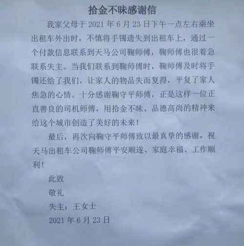 拾金不昧是中華民族的傳統(tǒng)美德,既是主流價值觀倡導“品德修養(yǎng)·潔身自愛”的人文瑰寶,更是華夏兒女傳承的非物質(zhì)文化遺產(chǎn)。2021年6月23號,一位老人在乘坐我們泰安旅汽天馬出租公司鞠守平師傅的出租車時不慎將拿去清洗的金手鐲遺落在車上。事發(fā)后,鞠師傅聯(lián)系不上失主,馬上將乘客遺失的物品交回公司,天馬出租公司劉經(jīng)理擔心失主著急,經(jīng)過多方聯(lián)系以及泰安市交通局出租辦的幫助,終于聯(lián)系上了正在著急的老人,并將物品歸還給失主。失主感動不已,說天馬出租的鞠師傅有一顆金子般的心,并委托朋友為鞠師傅送來了感謝信和錦旗。